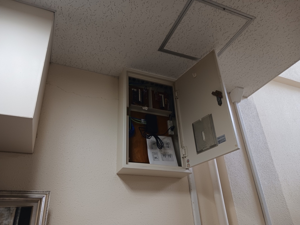 LAN配線を通したい部屋から写真の分電盤へLANケーブルをもってきてHUBを使用して繋げていきます。