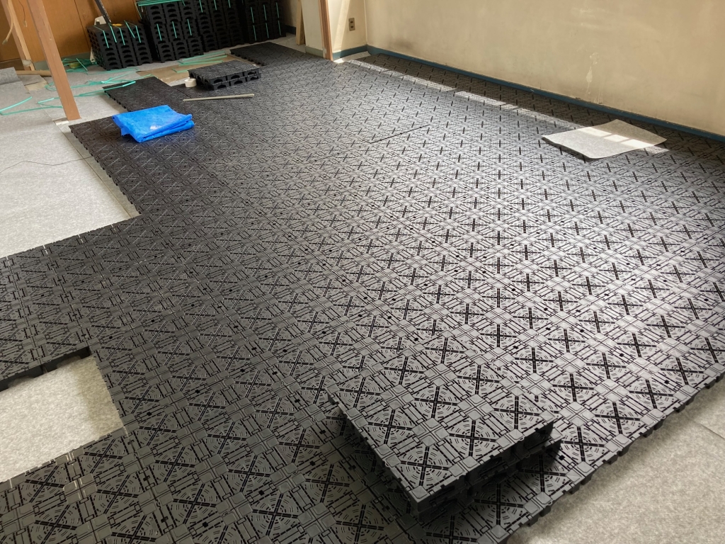 以下の写真は、OAフロア施工中で、樹脂製の置敷きタイプを使用しています。